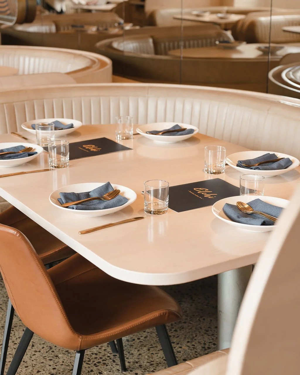 Natural leather banquettes imbue the space with a sense of luxury.